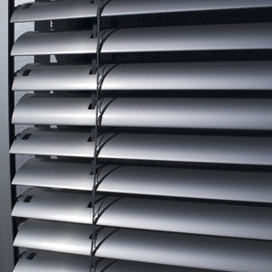 Lamellerna är försedda med styrtappar som löper i styrskenor på sidorna, vilket gör fasadpersiennerna vindsäkrad.
